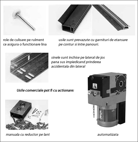 Sistemul de culisare verticală nu afectează spaţiul din jurul uşii, neexistând în acest fel zone moarte în interiorul halei. Având un design contemporan, atât funcţional cât şi vizual, uşile sunt perfect rezistente la intruziuni şi la factorii naturali ce deteriorează de obicei rapid o astfel de instalaţie: căldura sau frigul, noxele, gazele corozive, etc. Uşile secţionale optimizează în mod vizibil activitatea în interiorul întreprinderii, prin timpul redus şi simplitatea acţionării lor. Modelele sunt deosebit de silenţioase, datorită sistemelor speciale de culisare cu rulmenţi